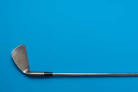 A close-up view of a gleaming golf club iron head displayed against a blue background, highlighting its intricate design and polished surface. Perfect for sports enthusiasts.