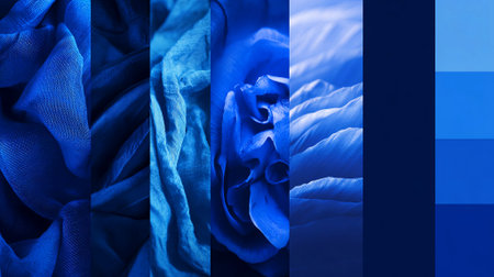 Various blue fabrics and a flower are arranged together, displaying a range of textures and shades, creating a visually appealing composition for artistic projects, AI generated