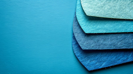 Vibrant sheets of felt fabric in shades of blue and green are neatly arranged on a turquoise background, ideal for various crafting and DIY projects. Copy space.