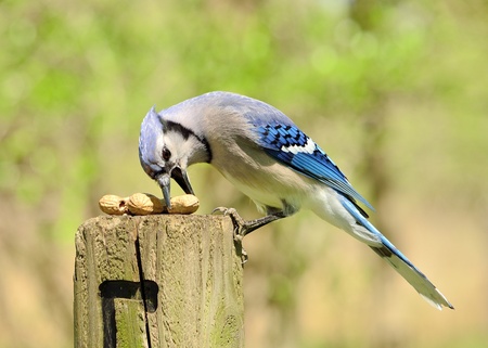 Blue Jay in summer with two peanuts in his beak with green background