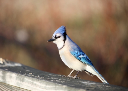 Beautiful blue jay bird sits on picnic table in a park