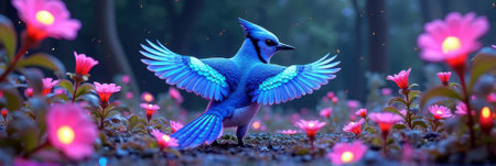Vibrant blue jay with open wings among glowing pink flowers in enchanted forest. That the image is generated using AI.