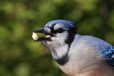 Blue Jay in summer with two peanuts in his beak with green background