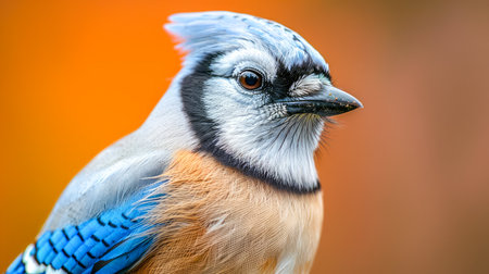 Close up Portrait of a Vibrant Blue Jay Bird with Detailed Feathers and Expressive Eyes on an Orange Blur Background AI Generative