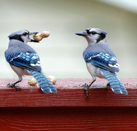 Blue jay with a peanut in its craw and another peanut in its beak