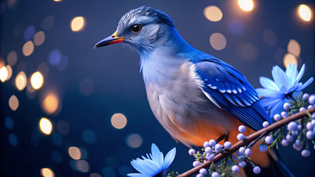 A vibrant blue bird with white and orange accents perches on a branch with delicate blue flowers and berries against a bokeh background of warm yellow lights.