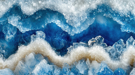 Vibrant abstract background displaying layers of blue and white crystals, featuring intricate textures and depth, ideal for artistic and design applications