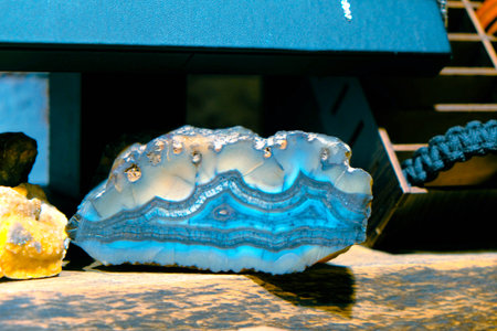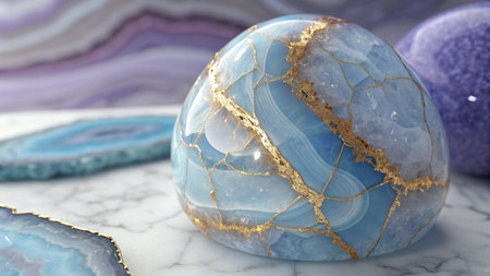 A captivating close-up image featuring blue agate stone with shimmering gold accents and crystal inclusions, showcasing intricate natural beauty and vibrant hues.