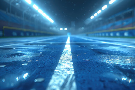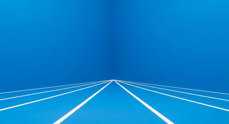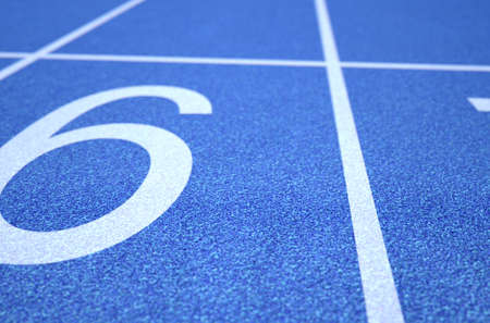 Blue running track lanes numbers 1 2 3 texture goal background. 3d rendering