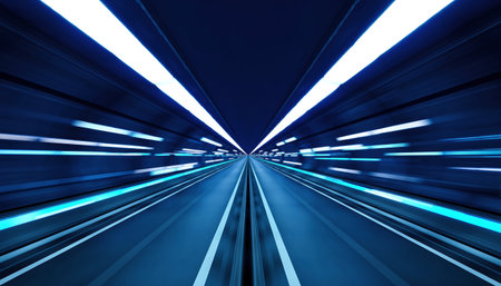 Dynamic view inside a modern blue and white tunnel, capturing the exhilarating feeling of rapid transit and digital speed