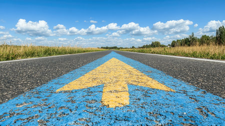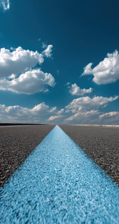 An asphalt road extends towards the horizon, marked by a central blue line. Above, a bright blue sky hosts numerous white, puffy clouds. The composition utilizes perspective, emphasizing depth and direction. This image could be suitable for illustrations, travel concepts, or design projects, offering versatile visual options.
