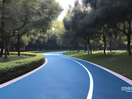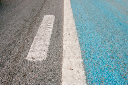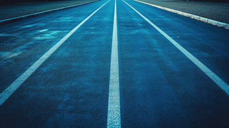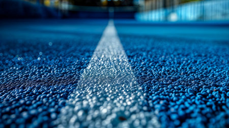 An extreme close-up shot focusing on a section of an athletics track. The prominently a bright blue running lane bordered by green artificial turf and marked with clean white lines. The perspective is straight on, emphasizing the texture and color of the track's surface. highlights the specialized and of a modern sports facility, representing athletic training, competition, and the vibrant environment of sports.