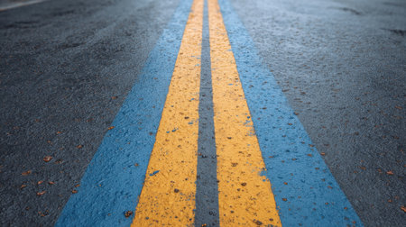 This image features a close-up view of a wet asphalt road with blue and yellow stripes creating a vibrant urban scene. The rain adds texture and mood.