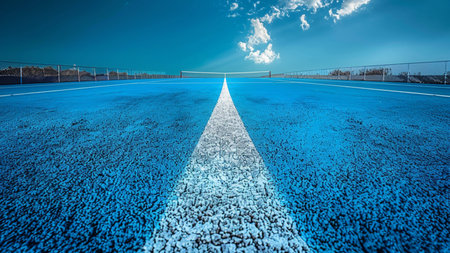 A 3D render of a section of the start line of an blue athletics track lane in the daytime