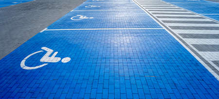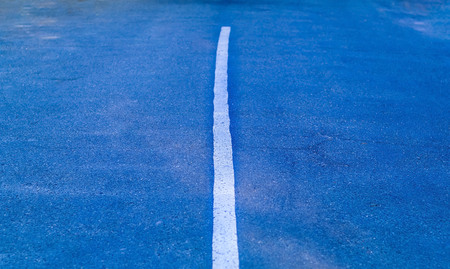 Abstract, blue background of newly made outdoor basketball court in park. Visible asphalt texture, freshly painted lines