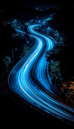 Winding Blue Highway Light Trails at Night, Long Exposure, Serene Scene, Travel Background