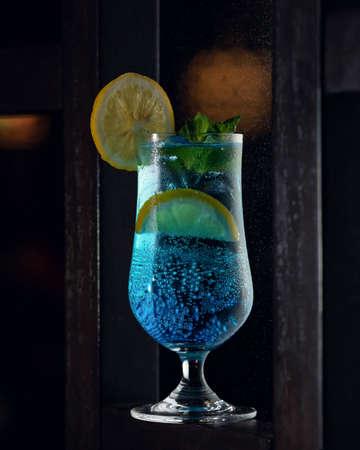 Alcoholic drink. Exotic blue cocktail with mint leaf, lemon slice and air bubbles on black background. Soft focus. Copy space.