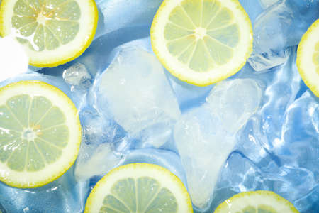 Lemon slices in a glass with ice and water and on bright blue background. Refreshment and detox.