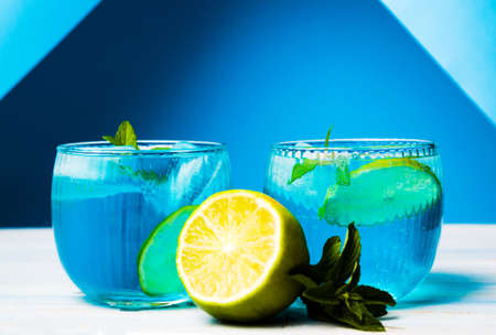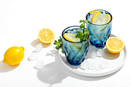 Two blue transparent glasses with cold lemonade stand on a white table, lemons, ice and mint lie next to it, selective focus on a lemon slice, close-up, copy space