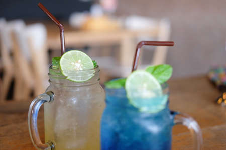 Blue lagoon cocktail with lime and ice on wooden table with bokeh background