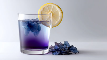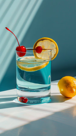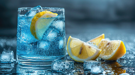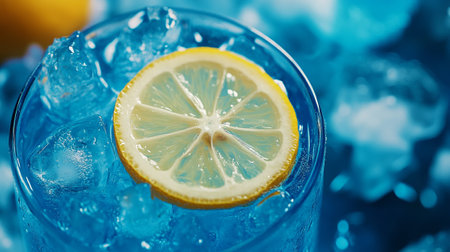 A vibrant, refreshing blue drink with ice and a lemon slice sits against a striking colorful background, perfect for summer vibes and relaxation.