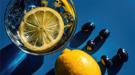 A glass of water with lemon slices and whole lemons nearby, cool blue tones, sharp focus, high resolution
