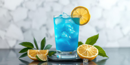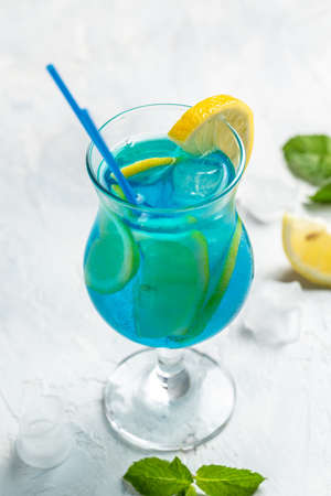 Blue lagoon cocktail with lemon and ice on blue background, close up
