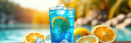 Refreshing blue drink with lemon slices and ice by the poolside in a sunny setting