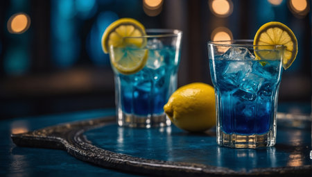 Bright turquoise cocktails with lemon slices set on a textured table by the seaside, evoking a cool and refreshing atmosphere perfect for summer.