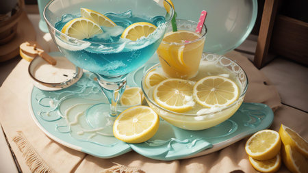 Refreshing turquoise cocktails with lemon slices placed on a textured table by the seaside, capturing the essence of a stylish and relaxing summer experience.