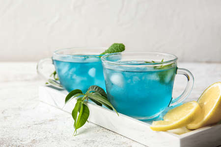 Board with glass cups of iced blue tea and lemon on light background, closeup