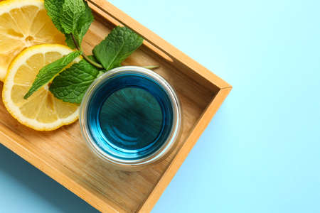 Wooden box with glass of organic blue tea, lemon and mint on color background