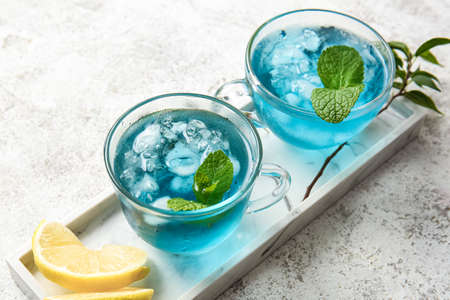 Bright blue beverage garnished with lemon and mint on a marble surface in a casual setting