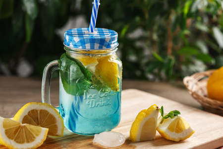 Blue cocktail with ice and lemon on a wooden table in the garden