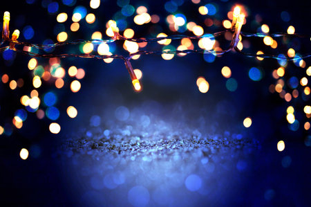 Christmas Garland Bokeh Lights on Dark Blue Background