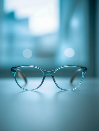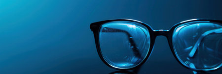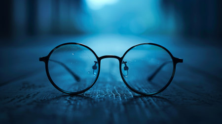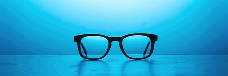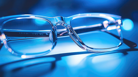 Stylish eyeglasses sit on a smooth surface, bathed in soothing blue light, creating a modern and eye-catching aesthetic.
