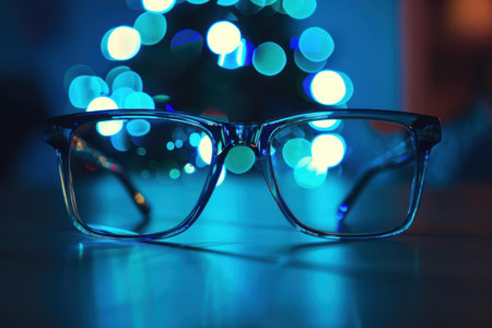 A pair of blue round glasses placed on a surface with blurred bokeh lights in the background, symbolizing vision, clarity, and style.
