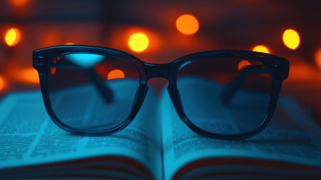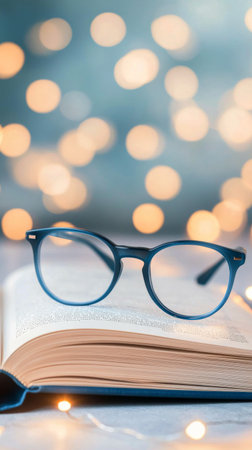 A stylish pair of glasses rests on an open book surrounded by soft, glowing lights. This image conveys a cozy atmosphere perfect for reading and relaxation.