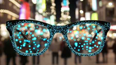Close-up view of eyeglasses reflecting a vibrant, blurred cityscape at night. The city lights create a mesmerizing bokeh effect, showcasing urban energy and abstract beauty.