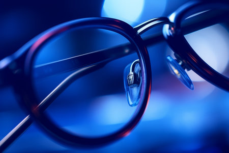 Stylish eyeglasses reflecting soft blue light on dark background