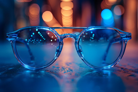 Stylish azure-tinted glasses with minimalist contours rest on a polished surface, highlighted by subtle urban lights and a gentle cityscape blur, evoking modern soph