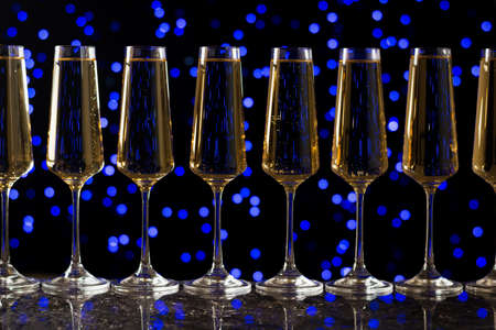 Lots of sparkling wine glasses on a blue bokeh background. A popular alcoholic drink.