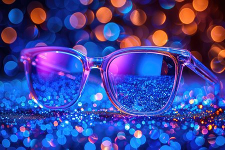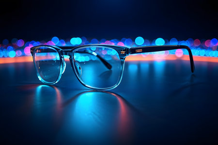 Stylish black glasses placed on a reflective surface against a backdrop of colorful bokeh lights, creating an immersive visual experience. blurred light dots appear on the lenses, enhancing the artistic and modern appeal. Generative AI