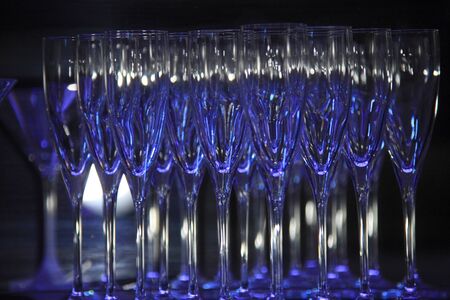 Wineglasses arranged in rows on the table in blue light