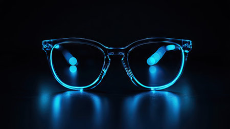Glasses with blue light lenses glowing slightly under soft lighting, set against a dark black background for a tech-savvy vibe