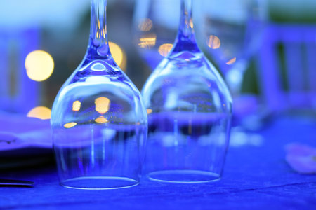 Empty wine glasses on table in restaurant. Color of the year 2020 classic blue toned