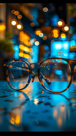 Closeup of eyeglasses on a reflective surface with colorful blurred lights