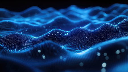 Flowing abstract blue waves with digital dot patterns forming smooth curves in motion.