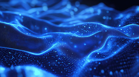 Abstract blue digital particles flowing data waves