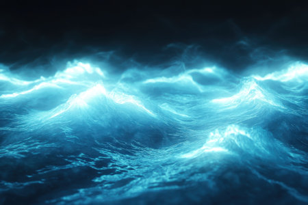 Surreal wave scene with glowing particles in blue tones